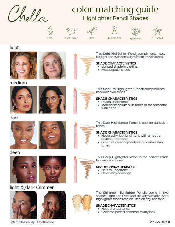 The Chella Highlighter Pencil Color Matching Guide helps you find your perfect shade instantly. This durable laminated guide matches your skin tone and brow color, so you can create bright, lifted, polished brows with confidence—every time.